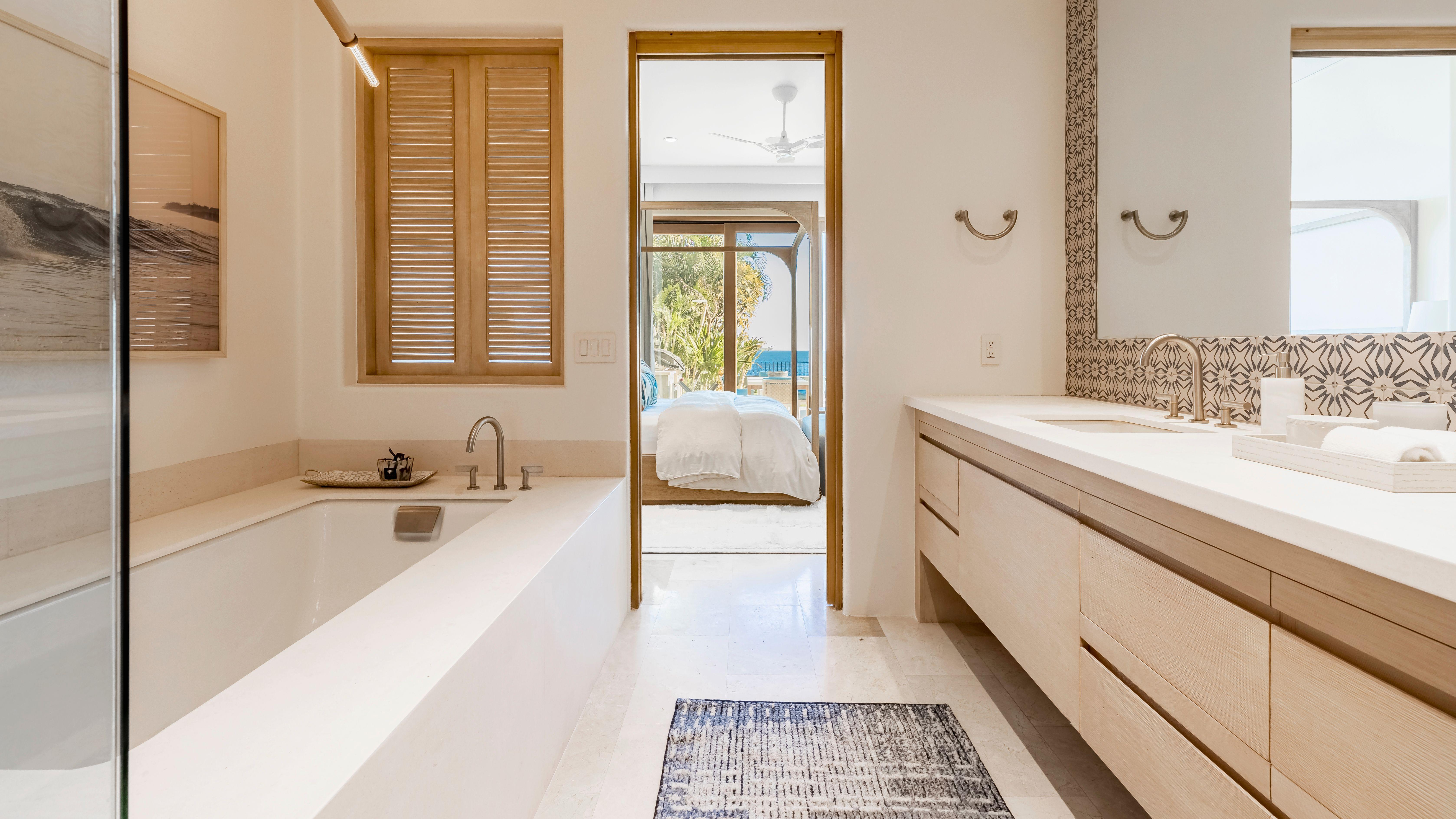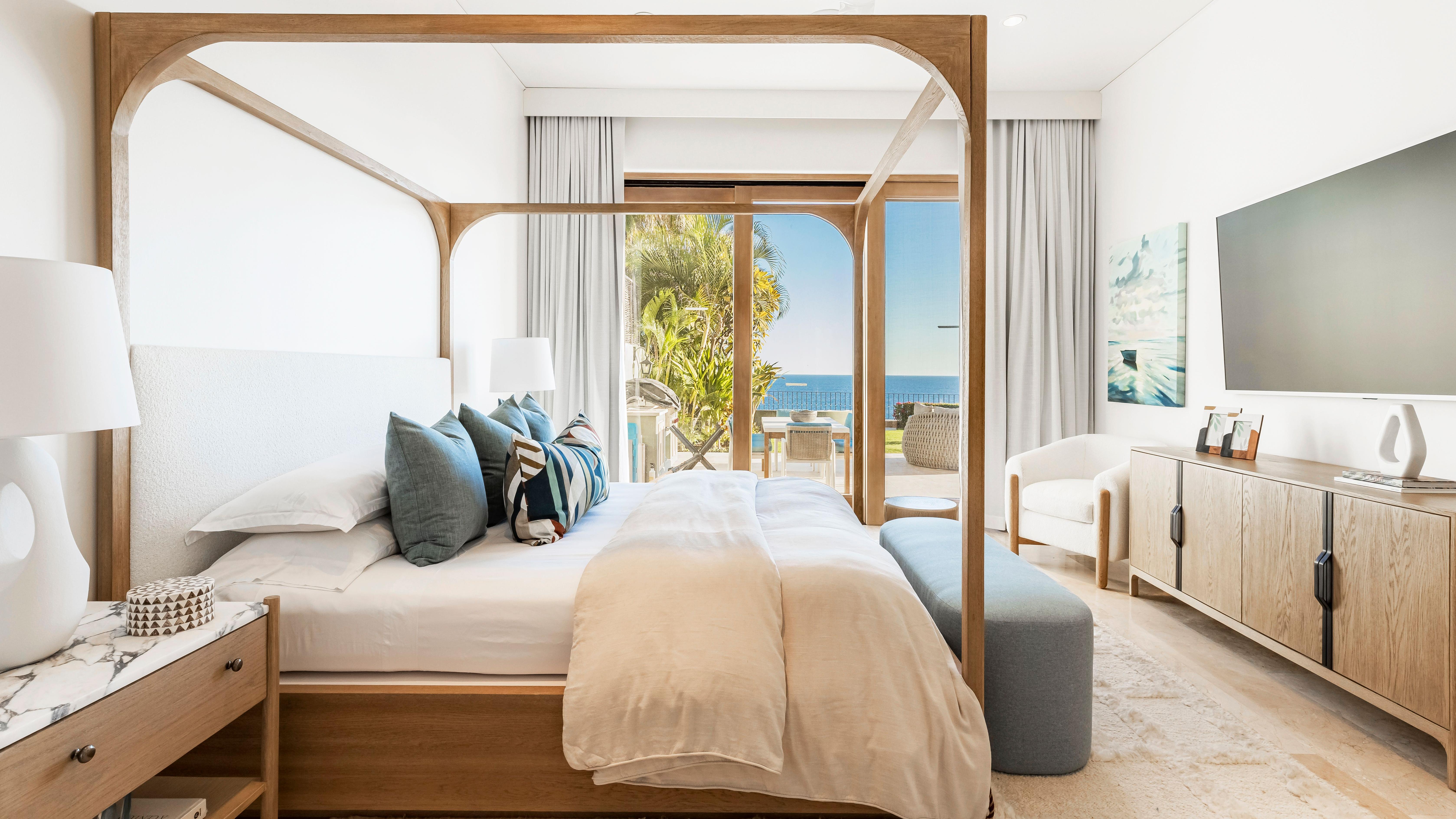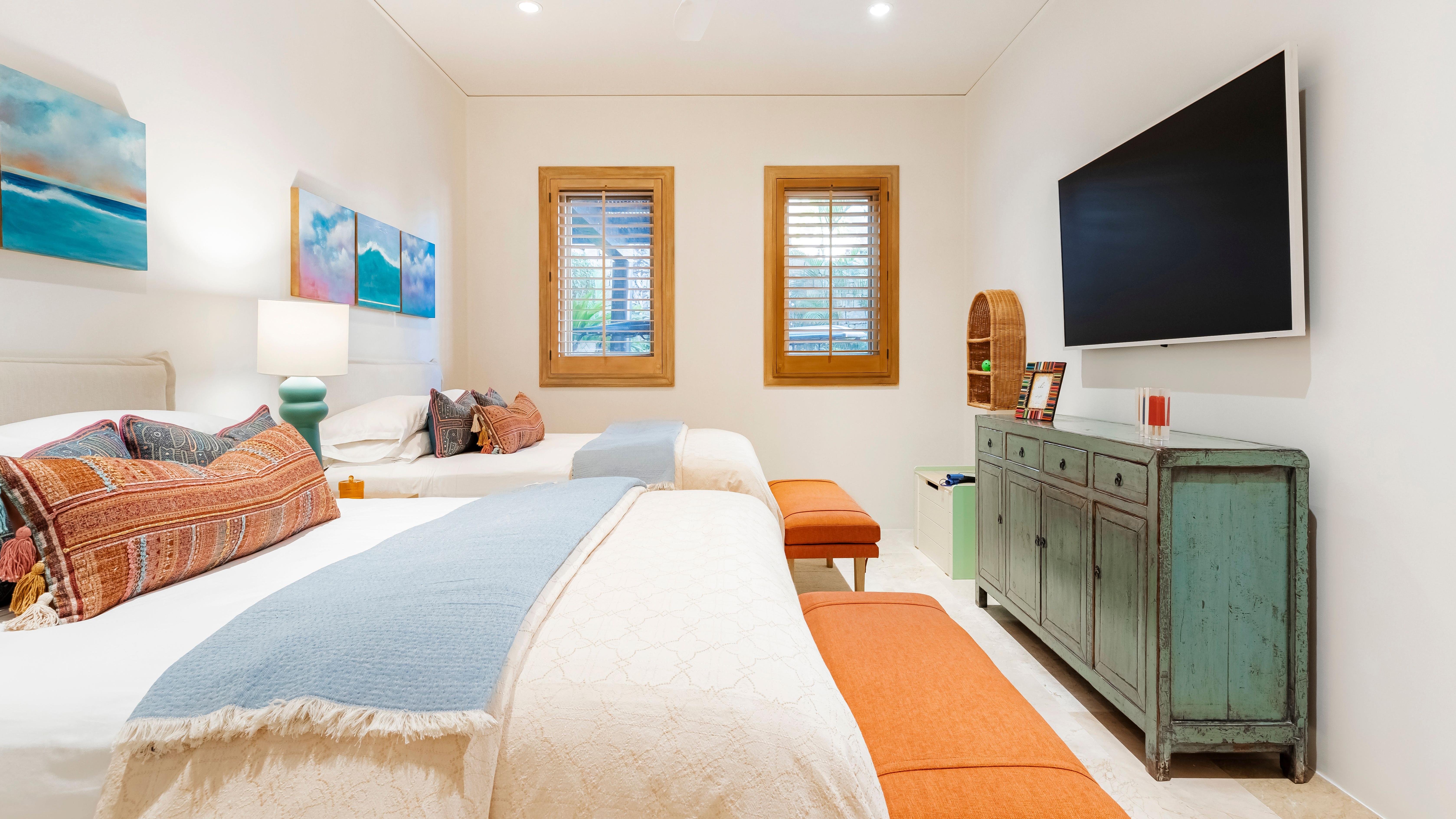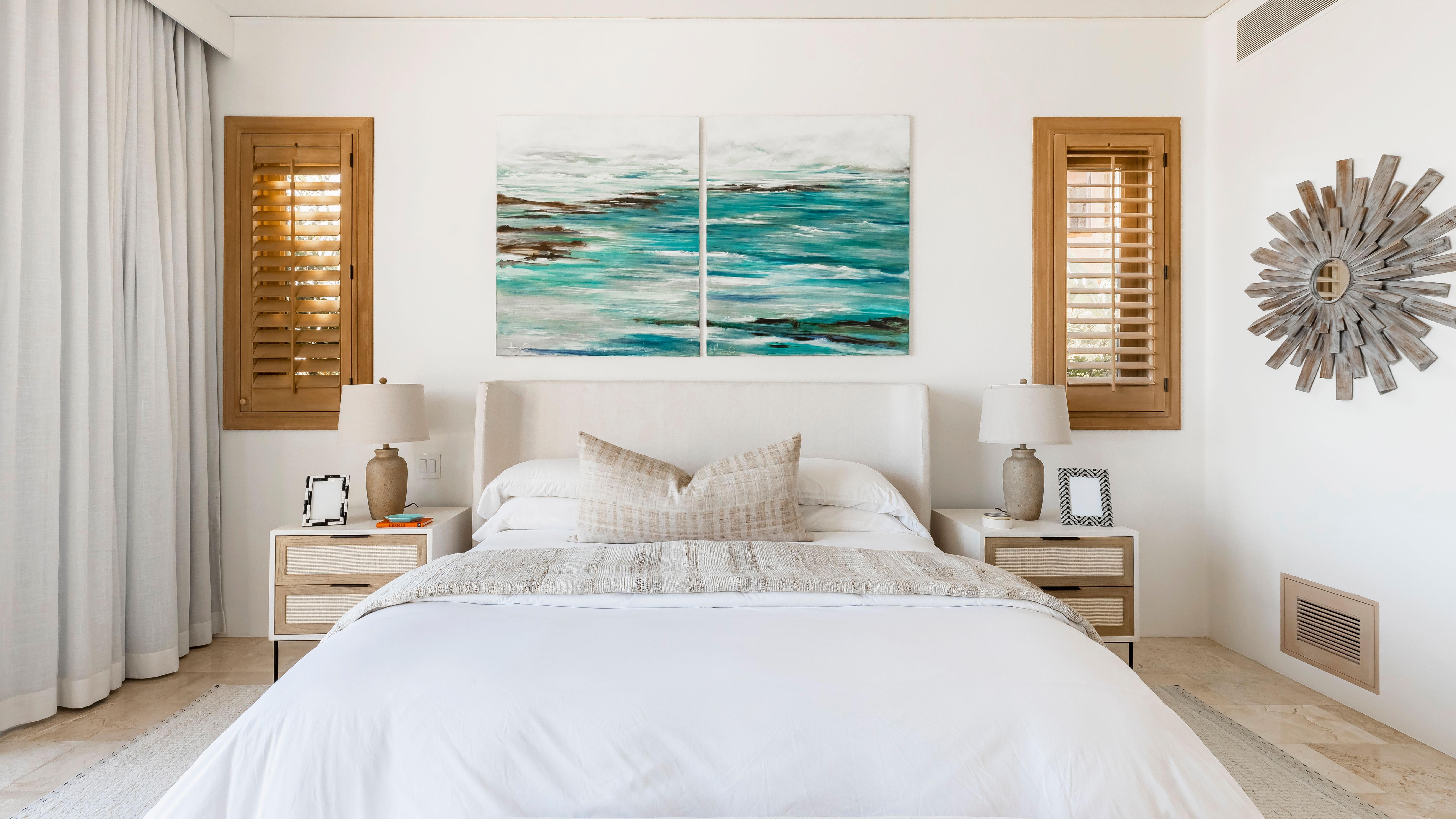 The neutral color palette of beige and white is combined with accents of blue, orange and terracotta, evoking the magical sunsets of the region. The warm white walls and the sandstone-toned woodwork create a cozy atmosphere, while the calacatta white marble with light brown and grey veins in the kitchen is the perfect backdrop to highlight the high-quality furniture and decor. Local and national art pieces add a sense of belonging.