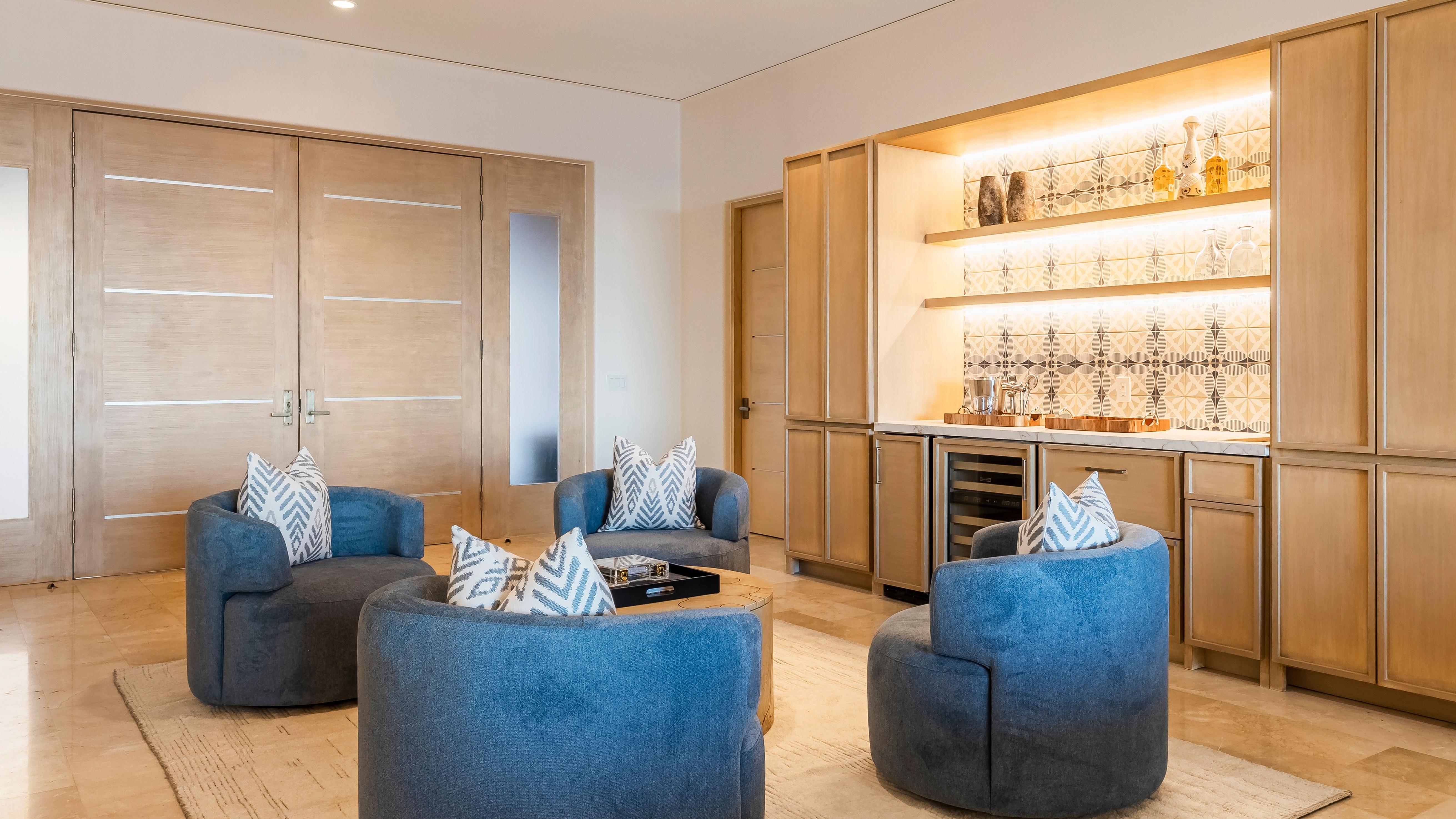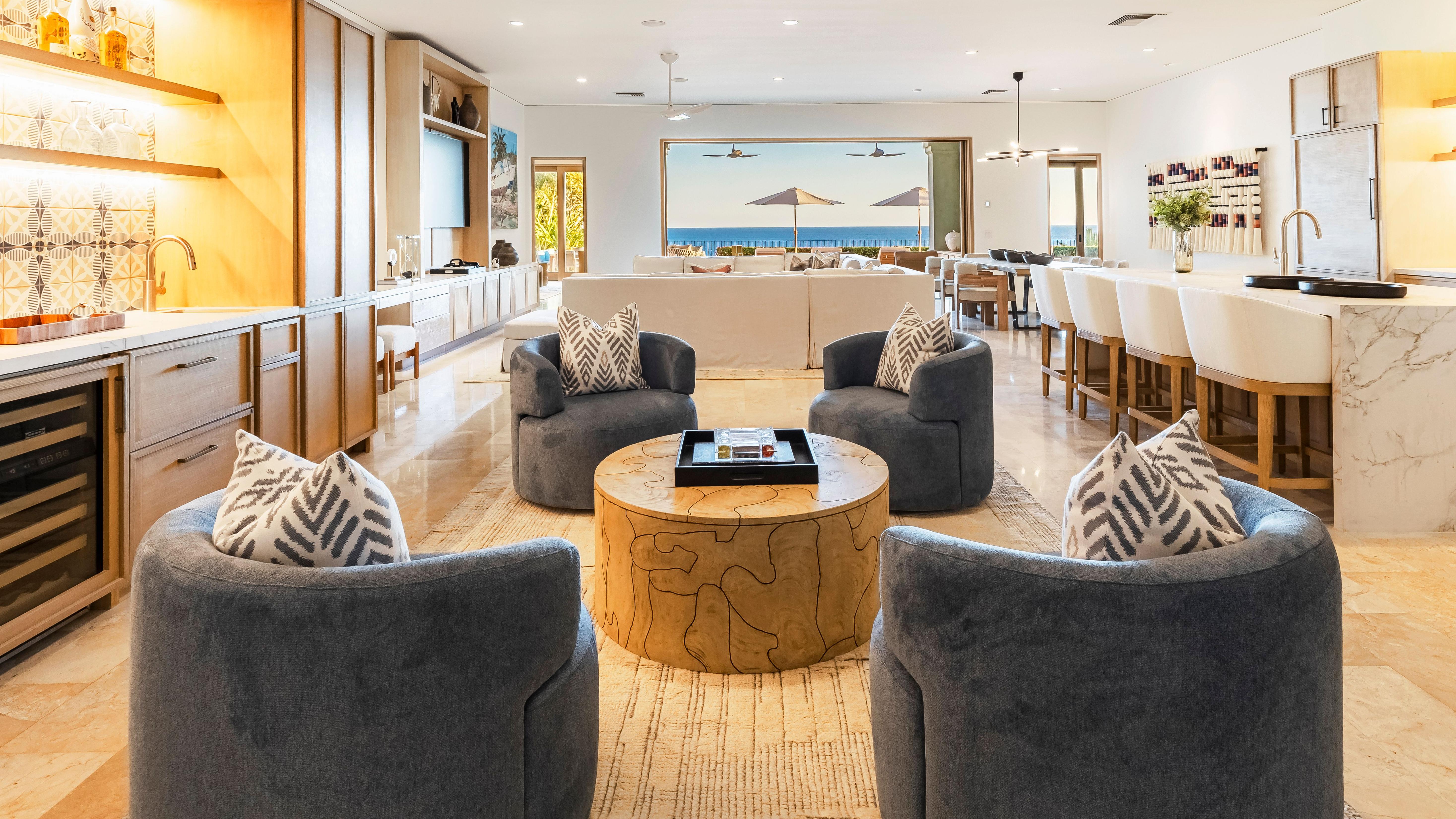 The interior bar and expansive living room are designed to welcome family and friends in a warm and hospitable atmosphere.