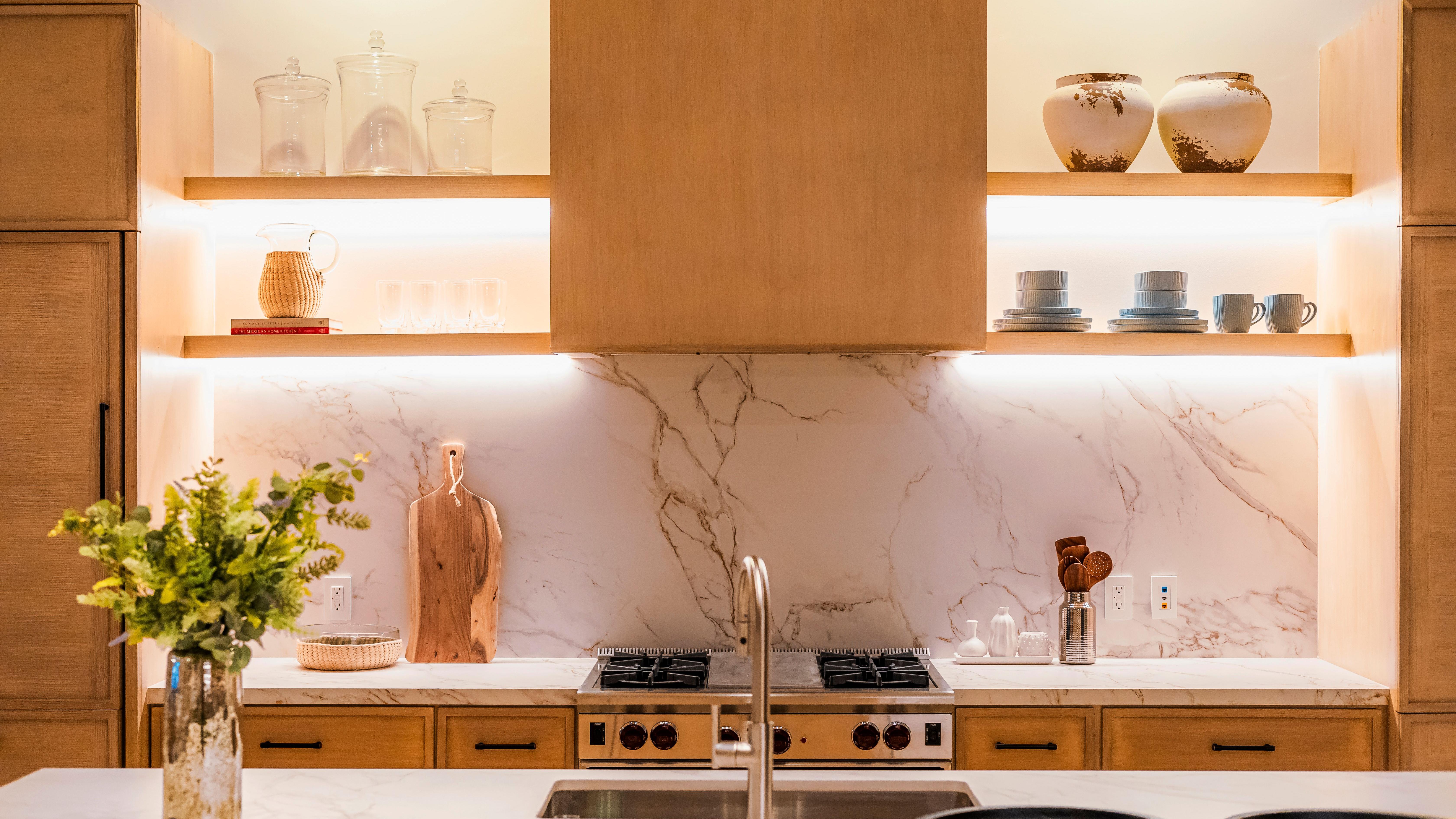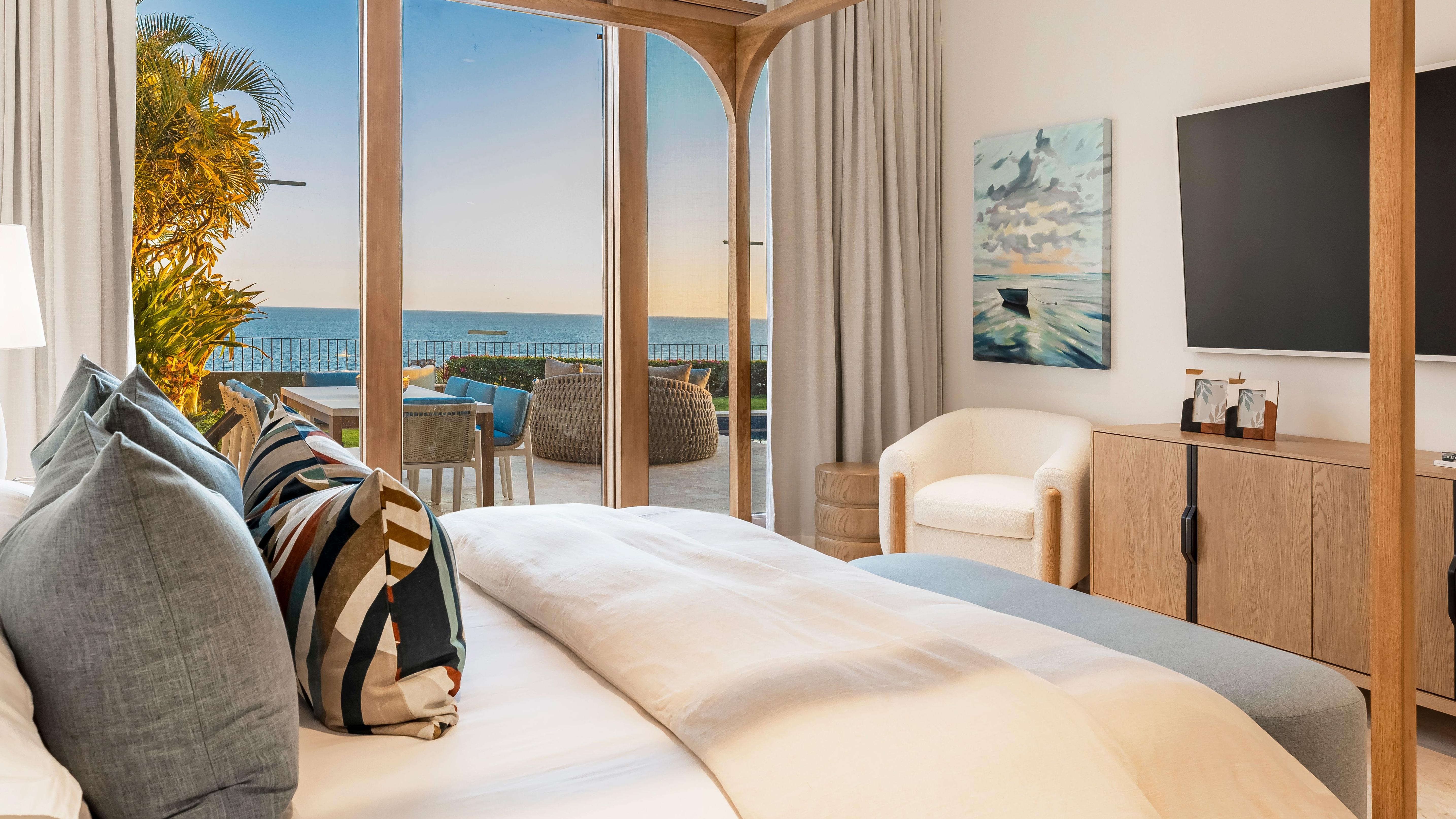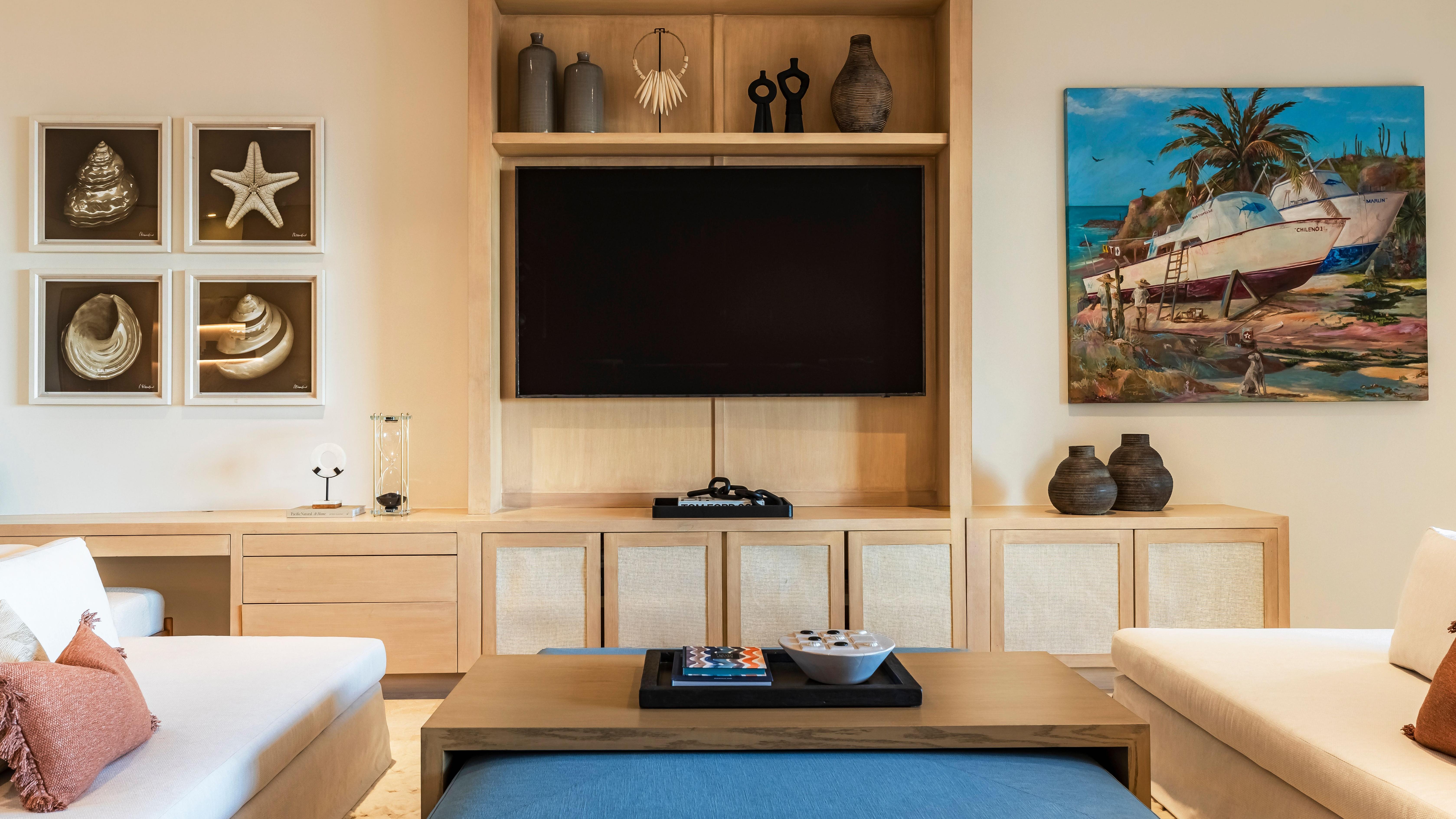 The neutral color palette of beige and white is combined with accents of blue, orange and terracotta, evoking the magical sunsets of the region. The warm white walls and the sandstone-toned woodwork create a cozy atmosphere, while the calacatta white marble with light brown and grey veins in the kitchen is the perfect backdrop to highlight the high-quality furniture and decor. Local and national art pieces add a sense of belonging.